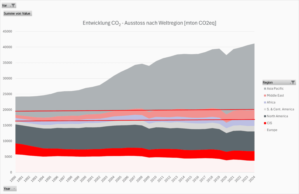 Die gesamten Einsparungen in Europa und den GUS-Staaten wurden durch steigende Emissionen in Nord- und Südamerika sowie in Afrika bereits mehr als wettgemacht. Besonders stark wuchs der Ausstoss im Mittleren Osten (+208 %) und in der Asien-Pazifik-Region (+258 %). Insgesamt liegen die globalen Emissionen heute 70 % höher als 1990.