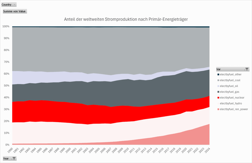 Immer mehr Strom wird aus erneuerbaren Quellen produziert. Vor zehn Jahren lag ihr Anteil noch bei 6.1 %, bis 2024 hat er sich auf 17.7 % fast verdreifacht. Der Zuwachs ging vor allem zulasten von Kohle: Ihr Anteil an der weltweiten Stromproduktion sank von knapp 40 % auf rund ein Drittel.