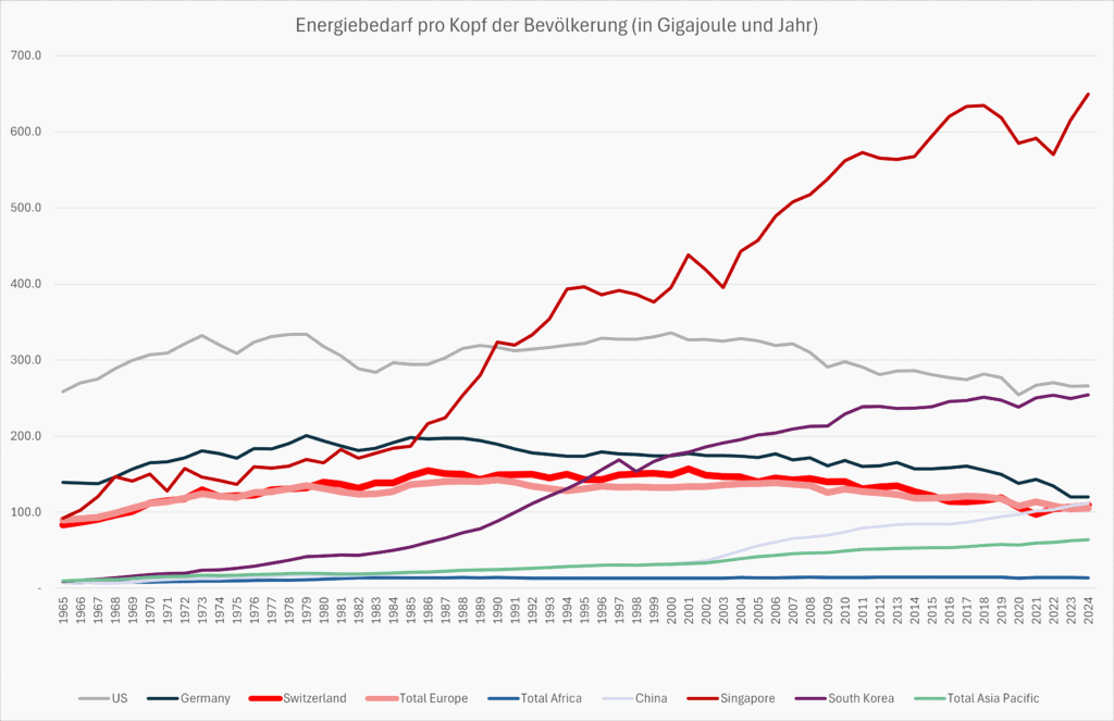 Auffallend ist, dass China beim Pro-Kopf-Verbrauch mittlerweile zu Europa und der Schweiz aufgeschlossen hat. In Ländern wie Singapur und Südkorea wächst der Energiebedarf besonders stark – getrieben durch Urbanisierung, Industrialisierung und den enormen Strombedarf neuer Rechenzentren.